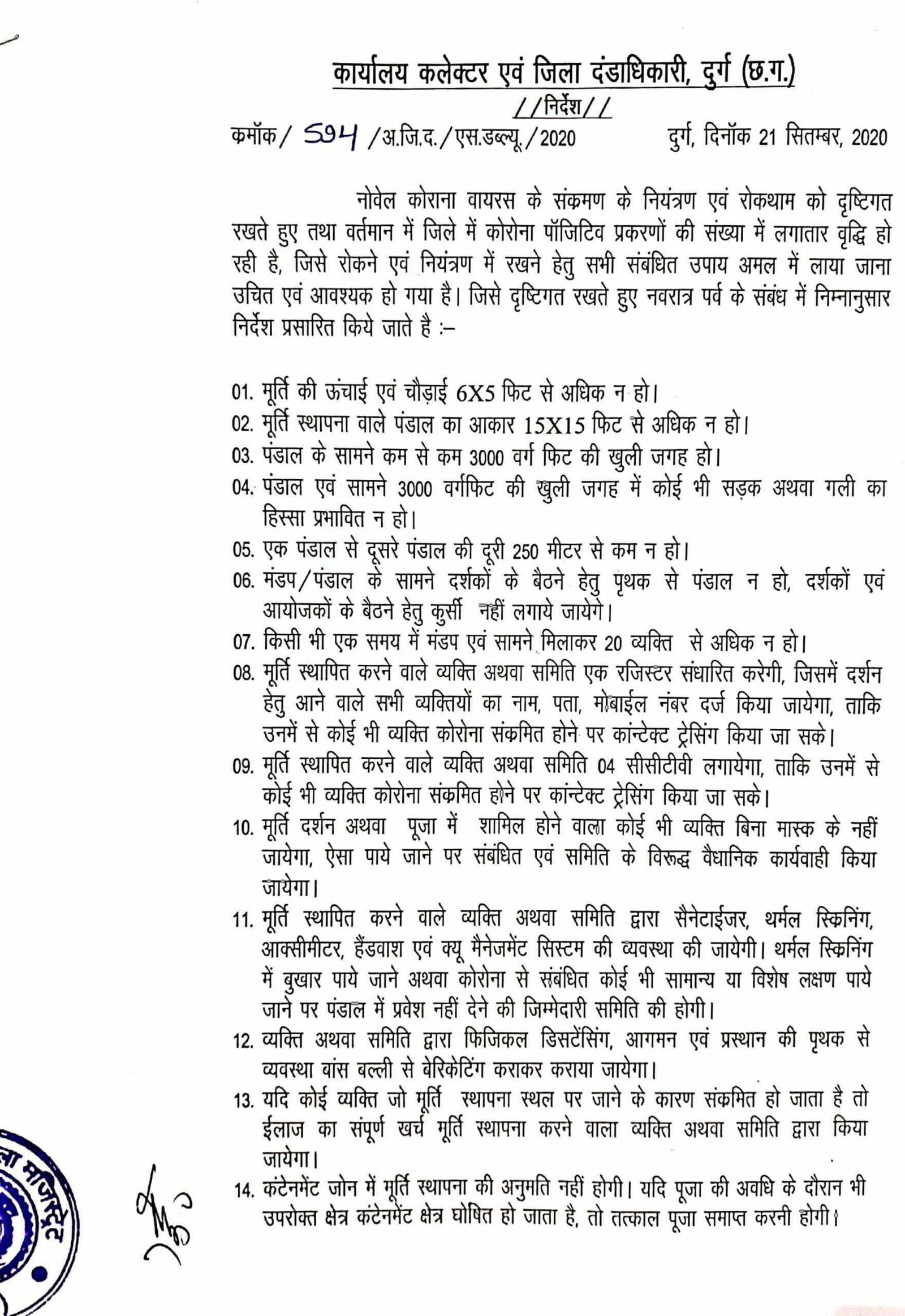 भिलाई। कोरोना संक्रमण बीच इसबार नवरात्रि को लेकर जिला प्रशासन ने दिशा निर्देश जारी कर दिया है। इस बार नवरात्रि का त्योहार में मां दुर्गा की प्रतिमा 6 फीट ऊंची व 5 फीट चौड़ी होगी। पंडाल का आकार 15 गुणा 15 फीट से अधिक नहीं होनी चाहिए। पंडाल के सामने दर्शकों के बैठने हेतु पृथक से पंडाल नहीं होगा वहीं पंडाल में 20 से अधिक व्यक्ति प्रवेश नहीं कर सकेंगे। मूर्ति स्थापित करने वाले व्यक्ति को दर्शन के लिए आने वाले प्रत्येक व्यक्तियों का नाम पता नोट करना होगा। मूर्ति स्थापित करने वाले व्यक्ति अथवा समिति 4 सीसीटीवी कैमरा लगाएंगे। कोई भी व्यक्ति मूर्ति स्थल जाने पर संक्रमित होता है तो उसके इलाज का खर्च समिति उठाएगी।