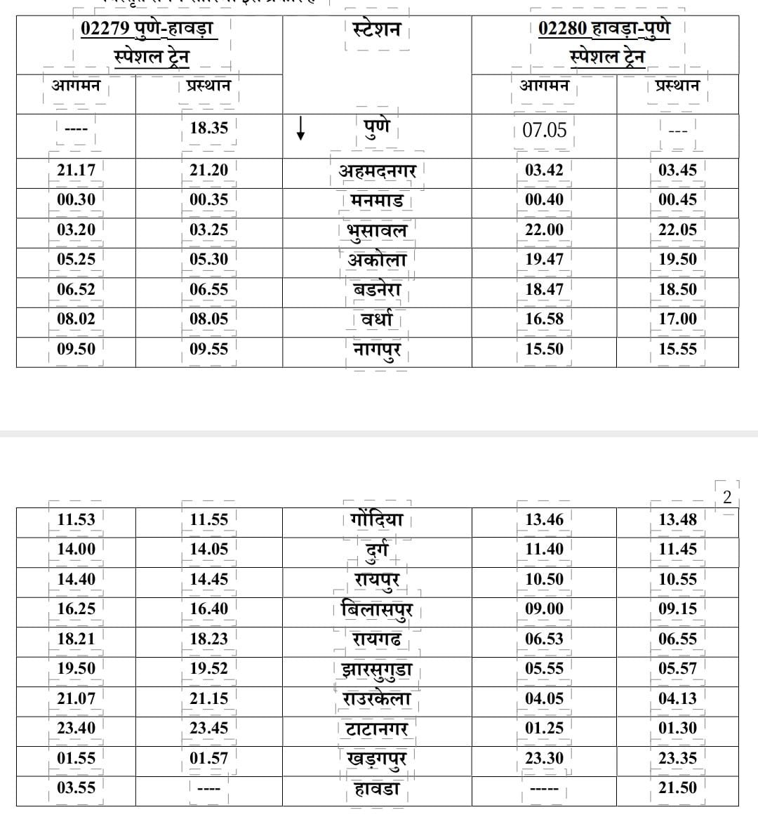 इस गाडी में 02 एसएलआर, 03 सामान्य, 06 एसी थ्री टीयर, 02 एसी टू , 10 शयनयान, 01 पेंट्रीकार सहित 24 कोचों के साथ चलाई जाएगी। 02279 पुणे-हावड़ा स्पेशल ट्रेन पुणे से 18.35 बजे रवाना होकर 14.00 बजे दुर्ग आगमन कर 14.05बजे प्रस्थान करेगी। रायपुर स्टेशन14.40 बजे आगमन कर 14.45 बजे रवाना होगी और अगले दिन 03.55 बजे हावड़ा पहुचेगी। इसी प्रकार 02280 हावड़ा-पुणे स्पेशल ट्रेन हावडा से 21.50 बजे रवाना होकर दूसरे दिन रायपुर 10.50 बजे पहुंचकर 10.55 बजे रवाना होगी। दुर्ग स्टेशन 11.40 बजे पहुंचकर 11.45 बजे रवाना होगी अगले दिन पुणे 07.05 बजे पहुचेगी।