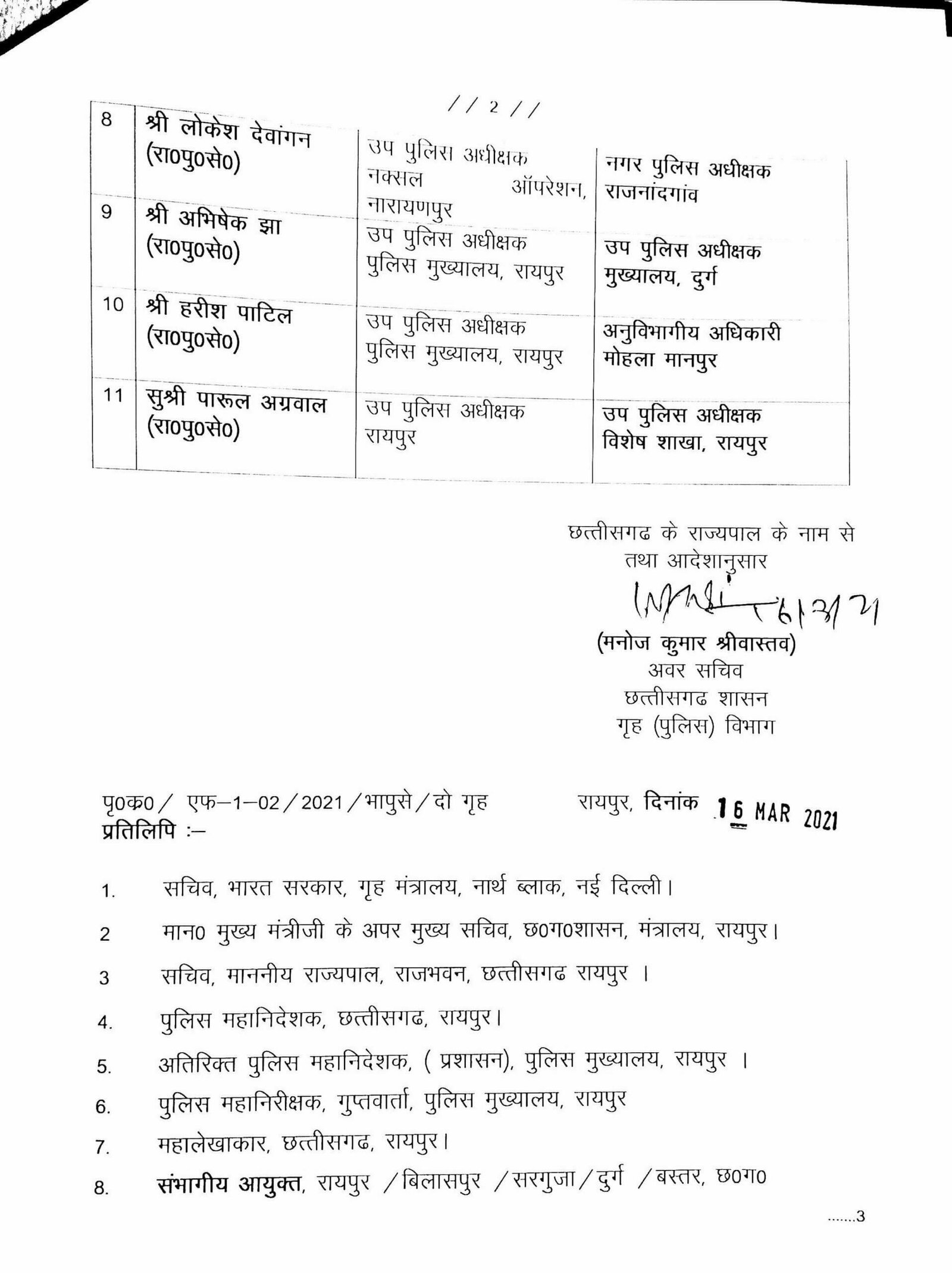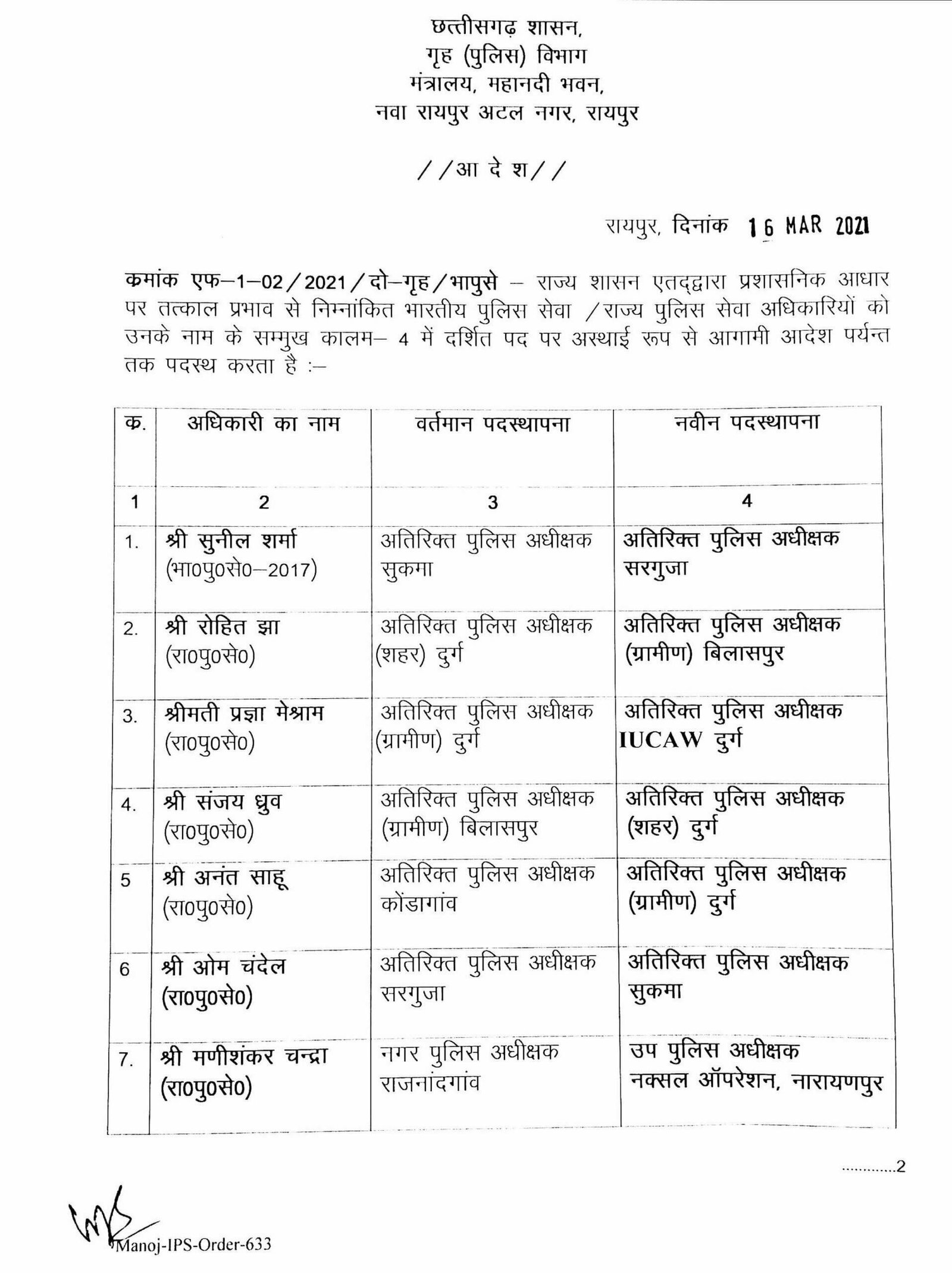 भिलाई। राज्य शासन ने पुलिस विभाग में बड़ा फेरबदल किया है। भारतीय पुलिस सेवा व राज्य पुलिस सेवा के 11 अधिकारियों को का ट्रांसफर किया गया है। इनमें दुर्ग शहर एसपी रोहित झा व दुर्ग शहर ग्रामीण एसपी प्रज्ञा मेश्राम का भी नाम शामिल है। रोहित झा अब बिलासपुर ग्रामीण के एसपी होंगे वही संजय ध्रुव को एसपी दुर्ग की जिम्मेदारी दी गई है। वहीं अनंत साहू एसपी दुर्ग ग्रामीण होंगे।