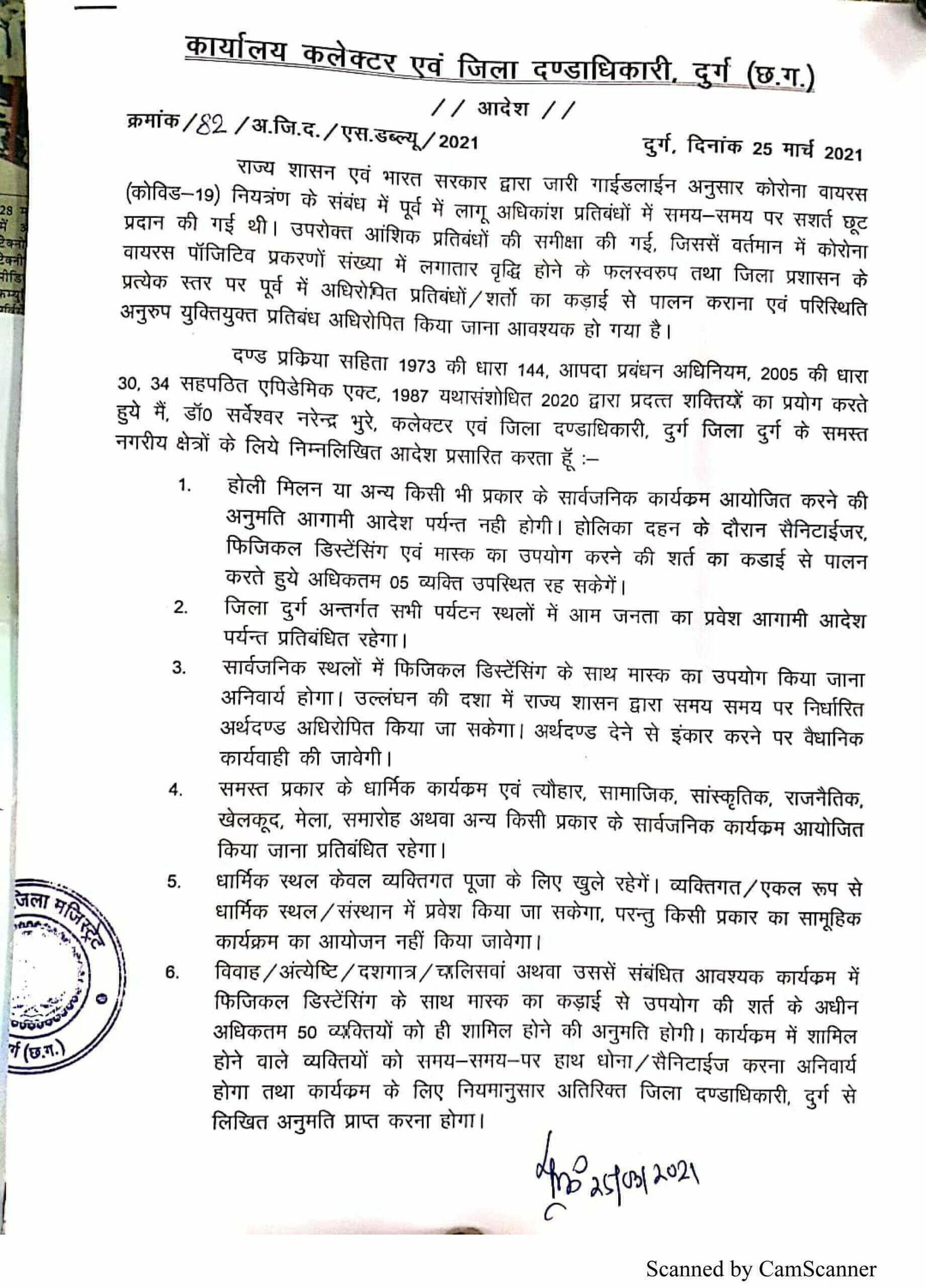 कलेक्टर द्वारा जारी आदेश के अनुसार होली मिलन व अन्य किसी भी प्रकार के सार्वजनिक कार्यक्रम आयोजित करने की अनुमति आगामी आदेश तक नहीं मिलेगी। होलिका दहन के दौरान सैनिटाइजर फिजिकल डिस्टेंसिंग एवं मास्क का उपयोग करने की शर्त पर कढ़ाई का पालन करते हुए अधिकतम पांच व्यक्ति ही उपस्थित रह सकेंगे। दुर्ग जिले के सभी पर्यटन स्थलों में आम जनता का प्रवेश आगामी आदेश तक प्रतिबंधित रहेगा। सार्वजनिक स्थलों में फिजिकल डिस्टेंसिंग के साथ मास्क का उपयोग किया जाना अनिवार्य होगा। आदेश का उल्लंघन करने की दशा में राज्य शासन द्वारा निर्धारित अर्थदंड आरोपित किया जाएगा। अर्थदंड नहीं देने पर वैधानिक कार्यवाही की जाएगी।