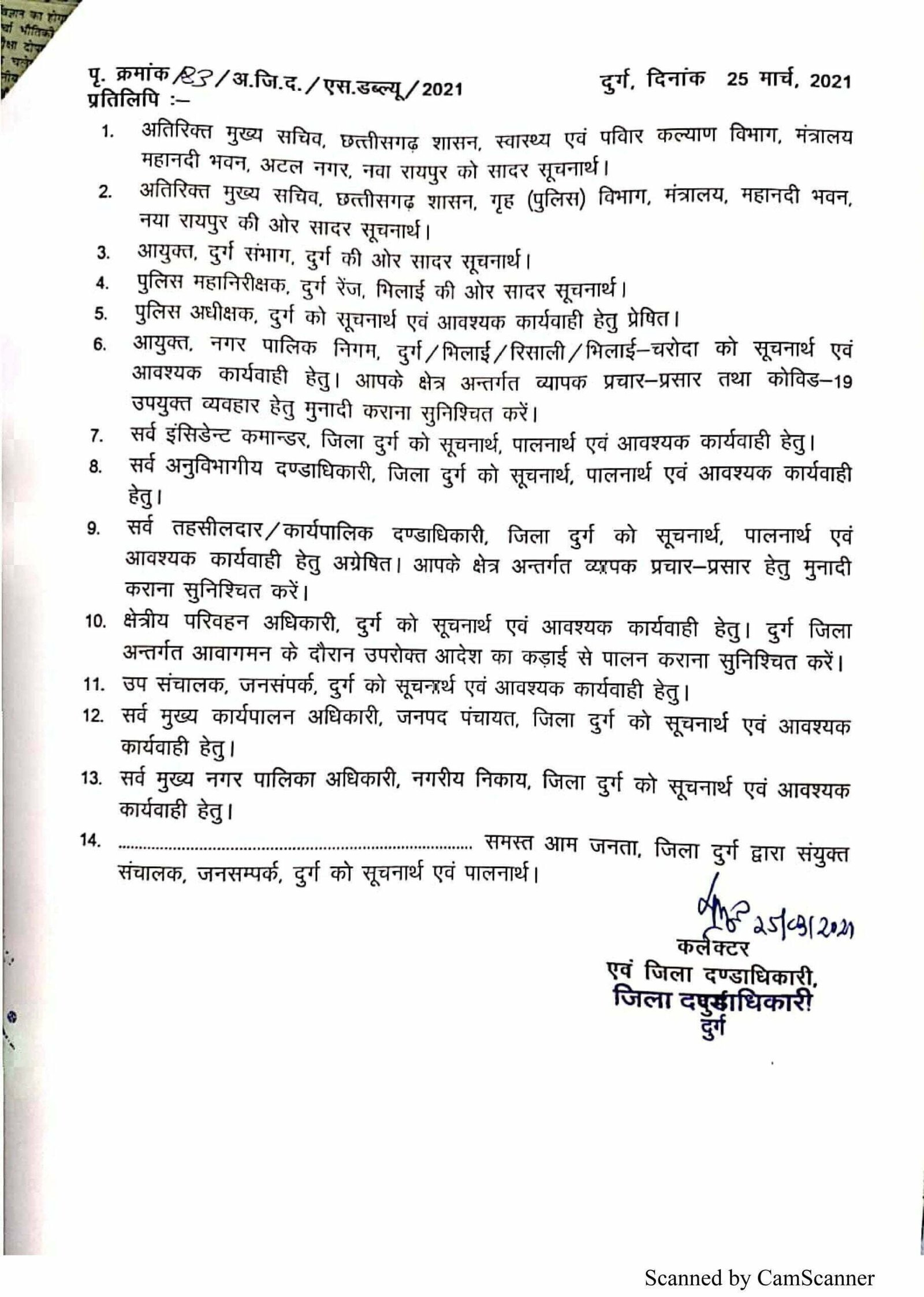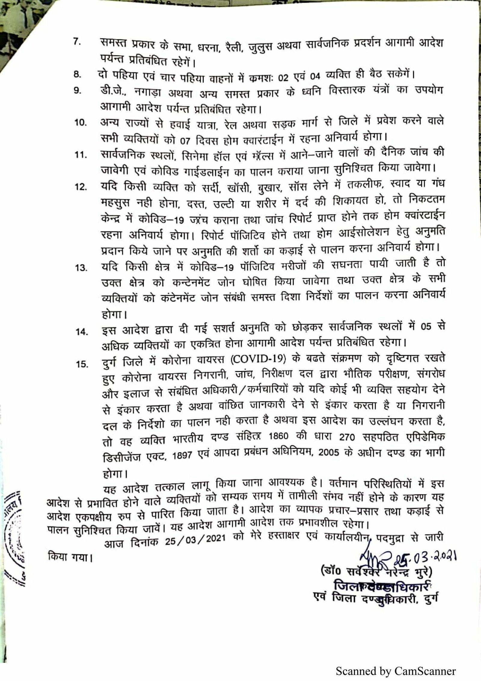 बता दें कि जिले में कोरोनावायरस पॉजिटिव प्रकरण संख्या में लगातार वृद्धि के कारण जिला प्रशासन ने बड़ा निर्णय लेते हुए सभी नगरीय क्षेत्रों में धारा 144 लागू कर दी है। इसके तहत सभी प्रकार के धार्मिक कार्यक्रम, सामाजिक, सांस्कृतिक, राजनीतिक, खेलकूद, मेला, समारोह अथवा अन्य किसी प्रकार के कार्यक्रम आयोजित किया जाना प्रतिबंधित रहेगा। धार्मिक स्थल केवल पूजा के लिए खुले रहेंगे। विवाह, अंत्येष्टि, चालीसा जैसे कार्यक्रमों में 50 से अधिक व्यक्तियों के शामिल होने पर प्रतिबंद रहेगा। सभी प्रकार के सभा धरना रैली जुलूस प्रतिबंधित रहेंगे। दो पहिया एवं चार पहिया वाहनों में क्रमश: दो एवं चार व्यक्ति ही बैठ सकेंगे डीजे नगाड़ा सहित अन्य ध्वनि विस्तारक यंत्रों का उपयोग आगामी आदेश तक प्रतिबंधित रहेगा। अन्य राज्यों से हवाई यात्रा रेल अथवा सड़क मार्ग से जिले में प्रवेश करने वाले सभी व्यक्तियों को 7 दिनों तक होम क्वारंटाइन में रहना होगा। सार्वजनिक स्थलों सिनेमा हॉल एवं मॉल्स में आने जाने वालों की दैनिक जांच की जाएगी। कोविड-19 के गाइडलाइन का पालन कराया जाना सुनिश्चित किया जाएगा।