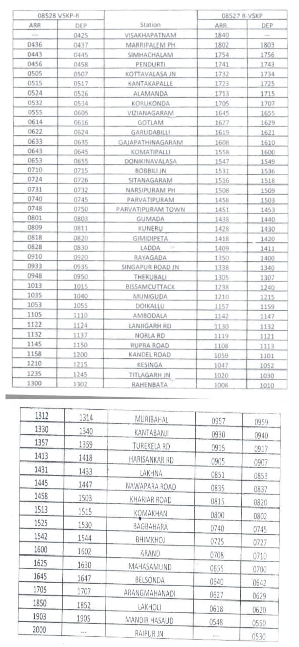 रेल मंडल रायपुर से मिली जानकारी के मुताबिक गाड़ी संख्या 08528/ 08527 रायपुर-विशाखापट्नम -रायपुर पैसेंजर स्पेशल ट्रेन की सुविधा शुरू की जा रही है। इस गाड़ी में 02 कोच एसएलआर, 8 सामान्य श्रेणी के कोच सहित कुल 10 कोच रहेंगे। गाड़ी संख्या 08528 विशाखापट्टनम रायपुर पैसेंजर स्पेशल विशाखापट्टनम से 4:25 बजे रवाना होकर 20:00 बजे रायपुर पहुंचेगी। गाड़ी संख्या 08527 रायपुर पैसेंजर स्पेशल रायपुर से 5:30 बजे रवाना होकर 18:40 बजे विशाखापट्टनम पहुंचेगी ।