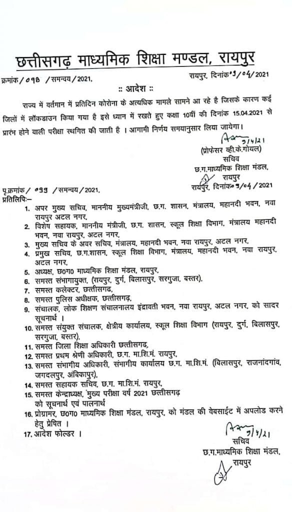 छत्तीसगढ माध्यमिक शिक्षा मण्डल रायपुर द्वारा राज्य में कोरोना के बढ़ते संक्रमण तथा कई जिलों में लॉकडाउन की स्थिति को ध्यान में रखते हुए कक्षा 10वीं की दिनांक 15 अप्रैल 2021 से प्रारंभ होने वाली बोर्ड परीक्षा स्थगित कर दी गई है।