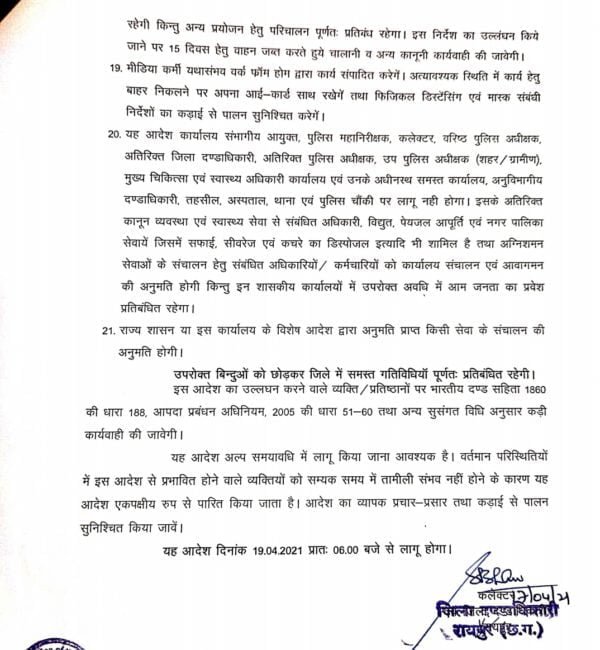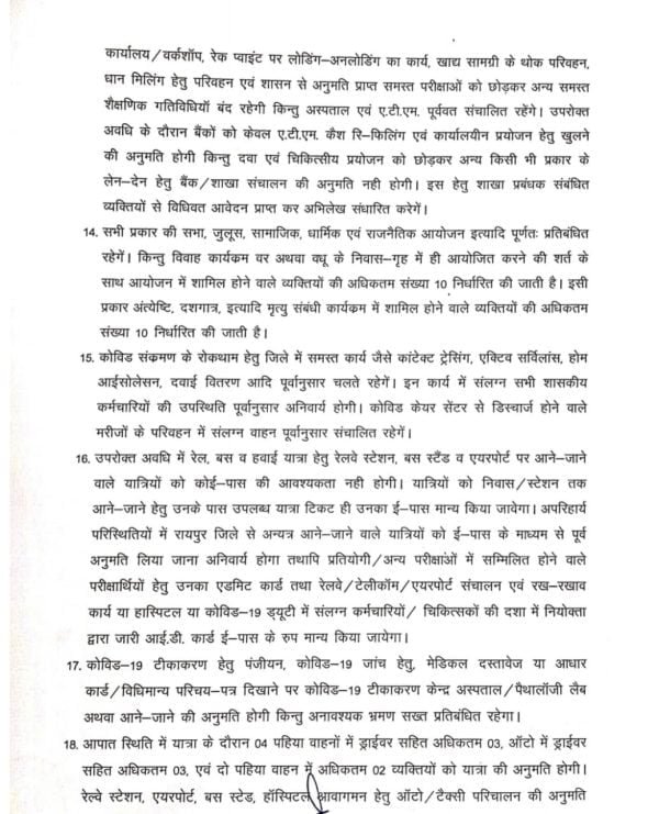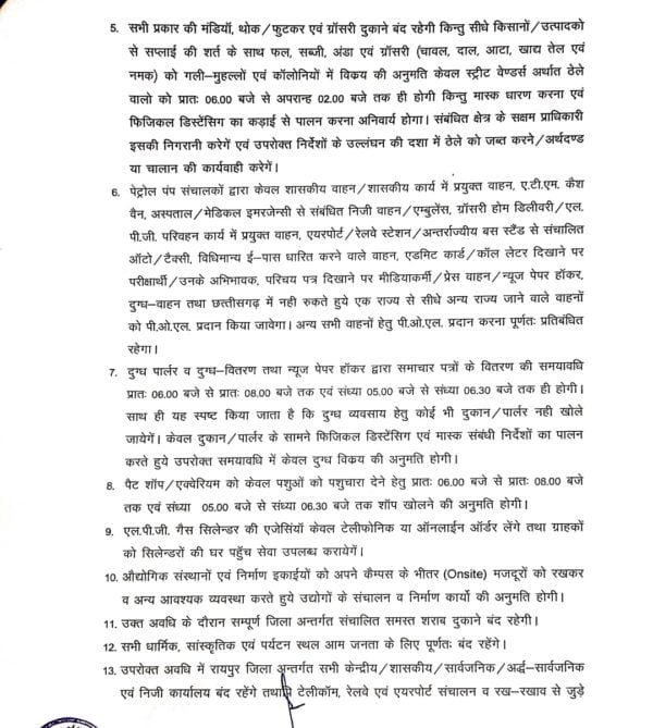 रायपुर कलेक्टर द्वारा जारी आदेश के मुताबिक लॉकडान के दौरान फल, सब्जी, अंडा व राशन सामग्री फेरी के द्वारा बेचने की अनुमति रहेगी। दूध के लिए सुबह 6 से 8 व शाम 5 से 6.30 बजे तक अनुमति होगी। पेट्रोलपंपों में शासकीय वाहनों व आवश्यक सेवा के लिए ही पेट्रोल दिया जाएगा। इसके अलावा लॉकडाउन में शासकीय उचित मूल्य की दुकानों को निर्धारित अवधि में खुलने की अनुमति होगी।