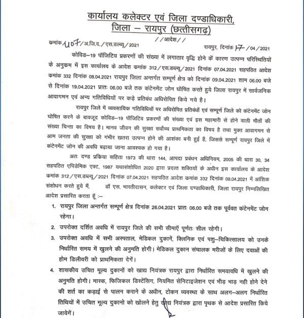 रायपुर। छत्तीसगढ़ में बढ़ कोरोना संक्रमण के कारण 22 जिलों में लॉकडाउन है। इस बीच रायपुर, जशपुर और राजनांदगांव में 26 अप्रैल तक और कोरबा में 27 अप्रैल तक लॉकडाउन बढ़ा दिया गया है। वहीं बस्तर के नारायणपुर जिले में भी लॉकडाउन का आदेश जारी कर दिया। यहां 19 से 26 अप्रैल तक लॉकडाउन रहेगा। यह जिला प्रदेश के सबसे कम सक्रिय मरीजों वाले जिले में से एक है। यहां अभी 113 मरीज हैं। इस लॉकडाउन में फल व सब्जी विक्रेताओं को छूट दी गई है।