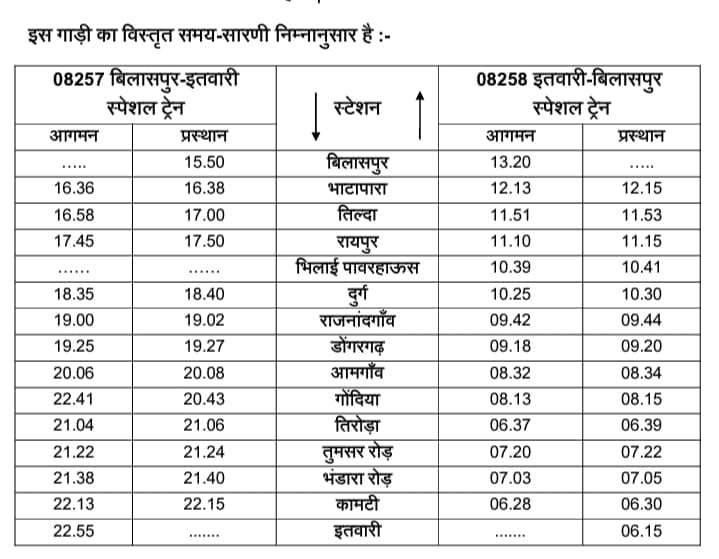 इसी प्रकार रेलवे प्रशासन द्वारा यात्रियों की सुविधा को ध्यान में रखते हुये बिलासपुर-इतवारी-बिलासपुर एक्सप्रेस स्पेशल ट्रेन का परिचालन प्रारम्भ किया जा रहा है । गाड़ी संख्या 08257 बिलासपुर-इतवारी 4 जुलाई से तथा गाड़ी संख्या 08258 इतवारी-बिलासपुर दिनांक 04 जुलाई से प्रतिदिन आगामी सूचना तक चलेगी। गाड़ी संख्या 08257 बिलासपुर-इतवारी एक्सप्रेस स्पेशल गाड़ी प्रतिदिन बिलासपुर से 15.50 बजे रवाना होगी तथा 22.55 बजे इतवारी पहुंचेगी 7 इसी प्रकार गाड़ी संख्या 08258 इतवारी-बिलासपुर एक्सप्रेस स्पेशल प्रतिदिन इतवारी से 06.15 बजे रवाना होगी तथा 13.20 बजे बिलासपुर पहुंचेगी। इस स्पेशल ट्रेन में एसएलआरडी-02, सामान्य-04, स्लीपर-11, 04 एसी-3, 01 एसी-2 तथा 01 एसी फस्र्ट सह एसी-2 सहित कुल 23 कोच की सुविधा उपलब्ध रहेगी । यह गाड़ी पूरी तरह आरक्षित है तथा केवल कंफर्म टिकट यात्रियों को ही यात्रा करने की अनुमति रहेगी साथ ही यात्रा के दौरान कोविड-19 के नियमों का आवश्यक रूप से पालन करना होगा।