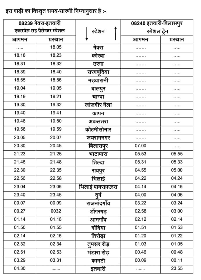 गाड़ी संख्या 08239 गेवरा-इतवारी एक्सप्रेस सह पैसेन्जर स्पेशल गाड़ी प्रतिदिन गेवरा से 18.05 बजे रवाना होगी तथा दूसरे दिन 04.30 बजे इतवारी पहुंचेगी। इसी प्रकार गाड़ी संख्या 08240 इतवारी-बिलासपुर एक्सप्रेस स्पेशल प्रतिदिन इतवारी से 23.55 बजे रवाना होगी तथा दूसरे दिन 7 बजे बिलासपुर पहुंचेगी। इस स्पेशल ट्रेन में एसएलआरडी-2, सामान्य-4, स्लीपर-11, 4 एसी-3, 1 एसी-2 तथा 1 एसी फस्र्ट सह एसी-2 सहित कुल 23 कोच की सुविधा उपलब्ध रहेगी।