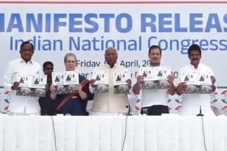नईदिल्ली। लोकसभा चुनाव 2024 के लिए कांग्रेस पार्टी ने अपना घोषणापत्र जारी कर दिया है। कांग्रेस अध्यक्ष मल्लिकार्जुन खरगे, पूर्व अध्यक्ष सोनिया गांधी और राहुल गांधी की मौजूदगी में अखिल भारतीय कांग्रेस समिति मुख्यालय में घोषणापत्र जारी किया। कांग्रेस पार्टी ने अपने घोषणापत्र को न्याय पत्र का नाम दिया है।…
