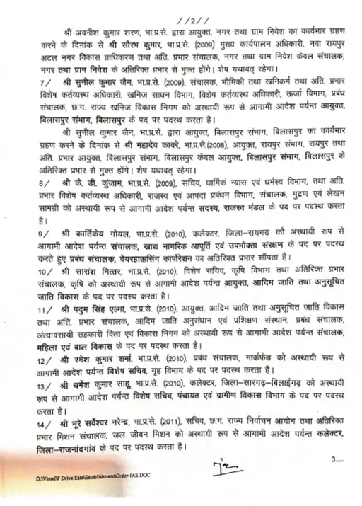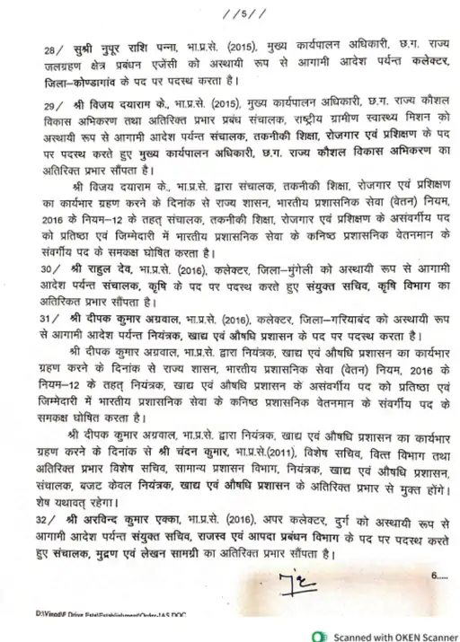 बिलासपुर कलेक्टर अवनीश कुमार शरण को कलेक्टर पद से हटाकर गृह निर्माण मंडल का आयुक्त बनाया गया है। रायगढ़ जिले के कलेक्टर कार्तिकेय गोयल को हटाकर खाद्य नागरिक आपूर्ति उपभोक्ता संरक्षण विभाग का संचालक बनाया गया है। वहीं सारंगढ़ जिले के कलेक्टर धर्मेश साहू को हटाकर पंचायत एवं ग्रामीण विकास विभाग का विशेष सचिव बनाया गया है। इसके अलावा गरियाबंद कलेक्टर दीपक अग्रवाल को खाद्य एवं औषधि प्रशासन विभाग का नियंत्रक बनाया गया है।