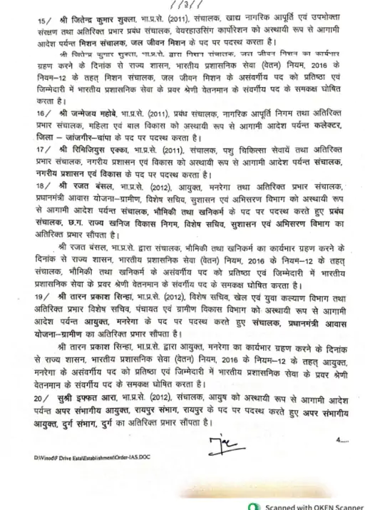 इसके अलावा इंद्रजीत चंद्रावल को खैरागढ़ छुईखदान गंडई जिले का कलेक्टर बनाया गया है। संजय अग्रवाल को बिलासपुर जिले का कलेक्टर बनाया गया है। दिव्या उमेश मिश्रा को बालोद जिले का कलेक्टर बनाया गया है। जन्मेजय महोबे को जांजगीर जिले का कलेक्टर बनाया गया है। सर्वेश्वर भुरे को राजनांदगांव जिले का कलेक्टर बनाया गया है।