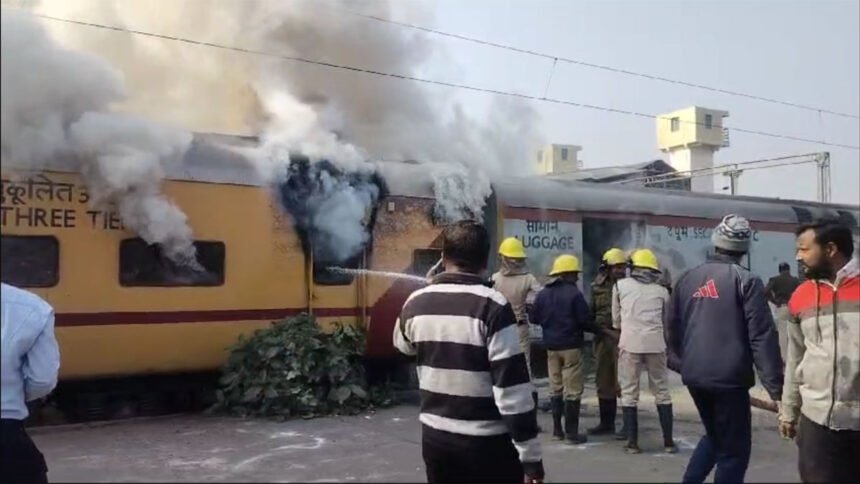 फायर ब्रिगेड की दो गाड़ियां पहुंची, आग से कोच का आधा हिस्सा जला