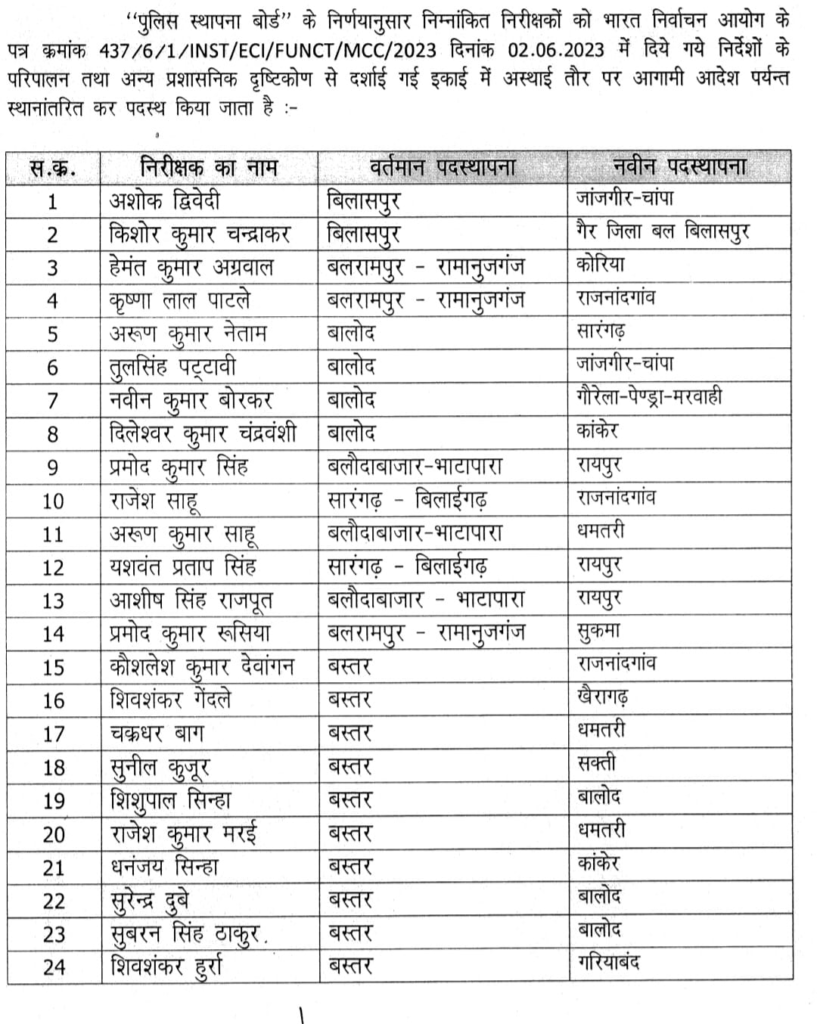 Reading: Transfer Breaking : छत्तीसगढ़ पुलिस में थोक में तबादले, दुर्ग जिले के 6 टीआई दूसरे जिले में ट्रांसफर.. PHQ से आदेश जारी