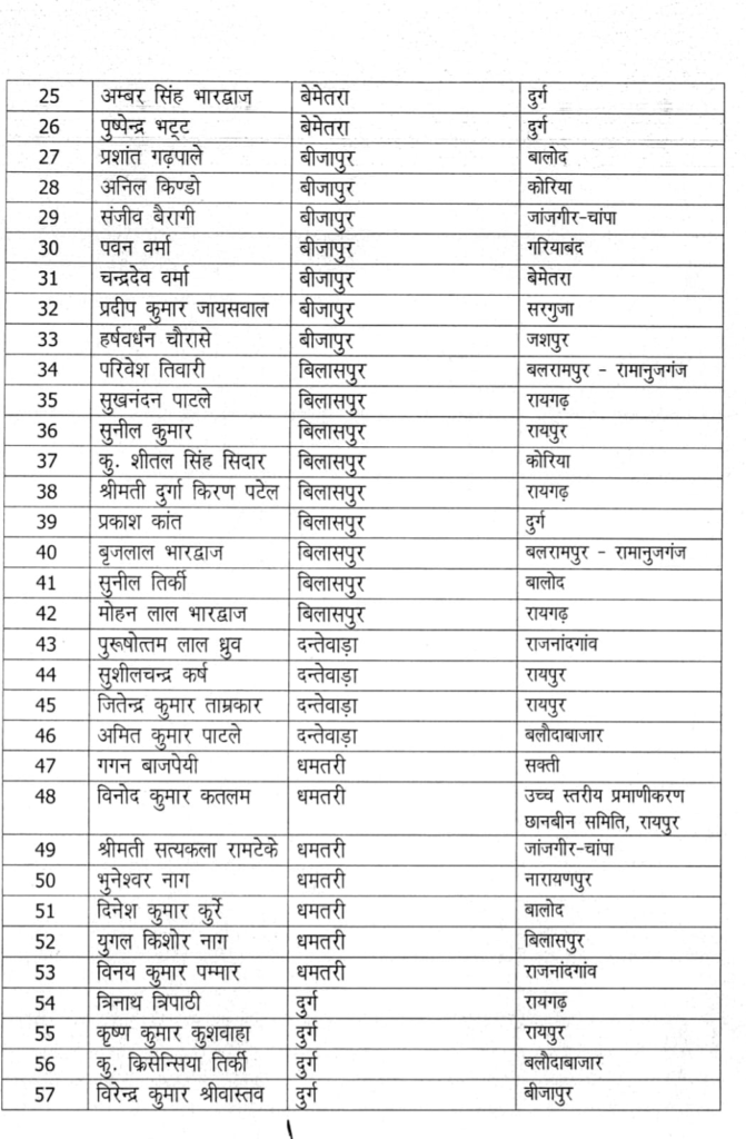 इसके अलावा दुर्ग जिले में 11 नए निरीक्षक स्तर के अधिकारियों के स्थानांतरण का आदेश भी हुआ है। इनमें रायपुर से महेश कुमार ध्रुव, उपेंद्र कुमार टंडन, गिरीश कुमार तिवारी, विजय कुमार यादव, सोनल ग्वाल, महासमुंद से केशवराम कोसले, कोरबा से अनिल कुमार पटेल, कबीरधाम से आनंद शुक्ला, बेमेतरा से अम्बर सिंह भारद्वाज, पुष्पेंद्र भट्ट व बिलासपुर से प्रकाश कांत का तबादला दुर्ग जिले में किया गया है।