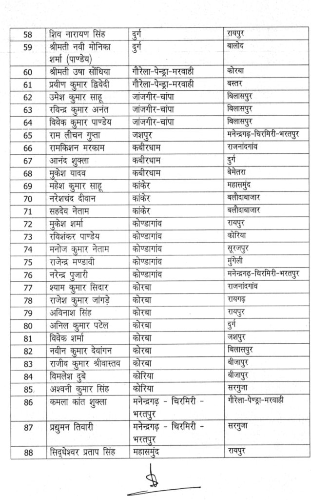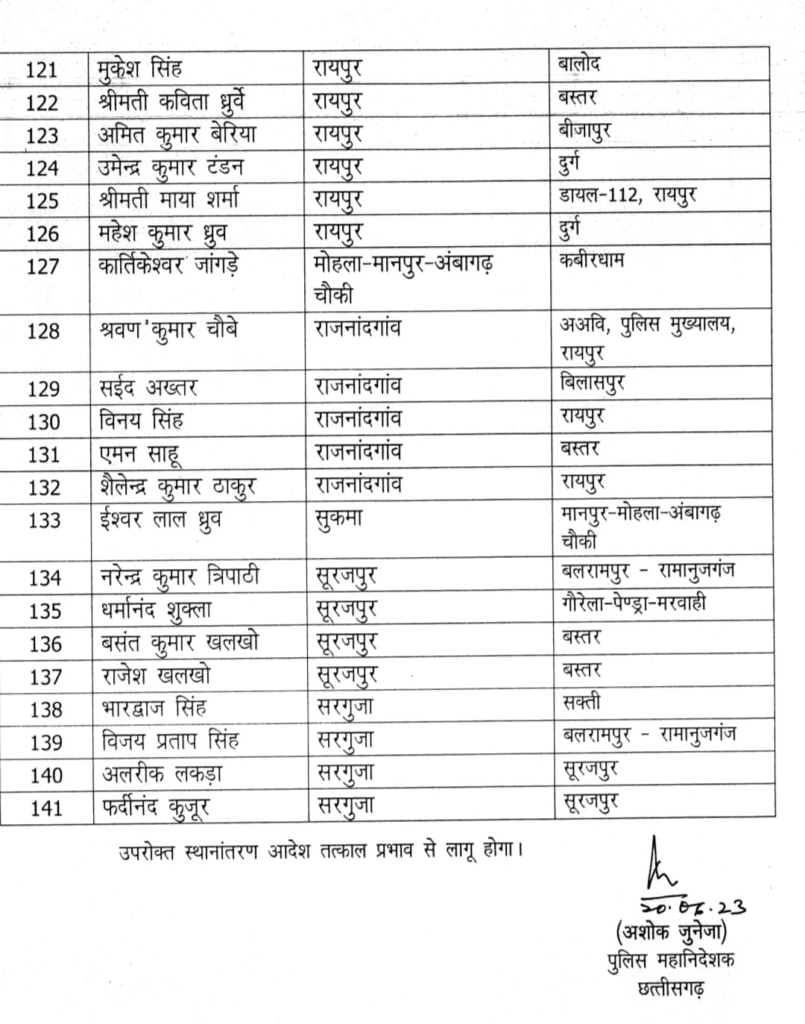 PHQ से मंगलवार को जारी आदेश के अनुसार दुर्ग जिले की छावनी थाना प्रभारी नवी मोनिका पांडेय का ट्रांसफर बालोद जिला कर दिया गया है। इसी प्रकार दुर्ग कोतवाली में पदस्थ शिव नारायण सिंह का रायपुर, भट्टी थाना प्रभारी कृष्ण कुमार कुशवाहा का रायपुर, खुर्सीपार थाना प्रभारी विरेंद्र कुमार श्रीवास्तव का बीजापुर, वैशाली नगर थाना प्रभारी त्रिनाथ त्रिपाठी का रायगढ़ ,महिला थाना प्रभारी सी.तिर्की का बलोदा बाजार ट्रांसफर कर दिया गया है।