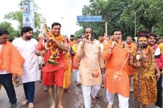 हजारों भक्तों के साथ शिवनाथ का जल लेकर निकले विधायक देवेंद्र, पुष्प वर्षा से जगह-जगह भव्य स्वागत
