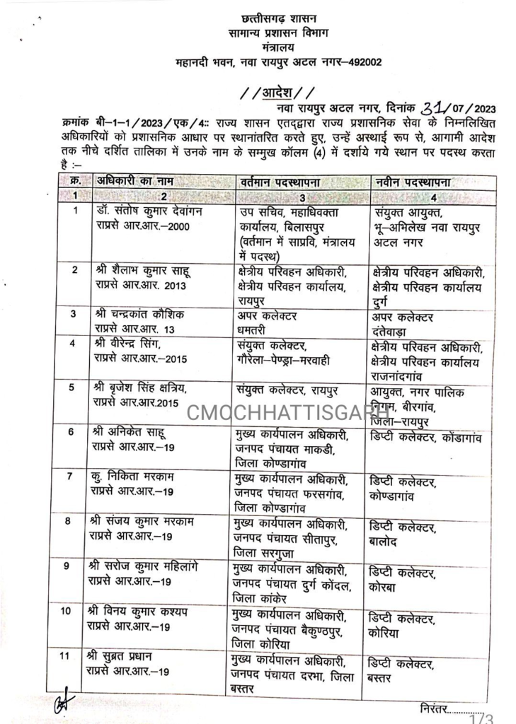 रायपुर। छत्तीसगढ़ में विधानसभा चुनाव से पहले प्रशासनिक सर्जरी जारी है। सरकार ने सोमवार को राज्य प्रशासनिक सेवा के 23 अफसरों का तबादला कर दिया है। सामान्य प्रशासन विभाग ने इस संबंध में आदेश जारी कर दिया है। जिन अफसरों का तबादला किया गया है उन्हें 2 अगस्त तक भार मुक्त करने का आदेश जारी किया गया है।