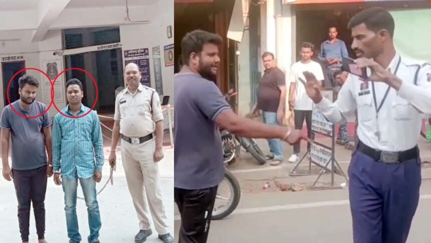जशपुर। छत्तीसगढ़ के जशपुर जिले में यातायात विभाग की कार्रवाई के दौरान नशे में धुत युवक ट्रैफिक जवान से भिड़ गया। युवक इतने नशे में था कि वह पुलिस कार्रवाई का ही विरोध करने लगा। ट्रैफिक जवान ने जब उसका वीडियो बनाना शुरू किया तो वह उससे भी उलझने लगा। इस पूरे में पुलिस ने कार्रवाई कर नशेड़ी युवक व उसके साथी को गिरफ्तार कर लिया गया है। आरोपियों के खिलाफ कुनकुरी पुलिस ने मारपीट, गाली गलौच व लोक सेवक के कर्तव्य में बाधा डालने के लिए बीएनएस की धारा 296,115(2),351(2),132,121(1) व 3(5) के तहत अपराध दर्ज कर जेल भेज दिया है।