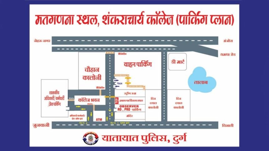 भिलाई। छत्तीसगढ़ में विधानसभा चुनाव के बाद 3 दिसंबर को मतगणना होनी है। भिलाई के श्री शंकराचार्य इंजीनियरिंग कॉलेज में मतगणना होगी। इसके लिए दुर्ग पुलिस पार्किंग प्लान तैयार कर लिया है। दुर्ग एसपी रामगोपल गर्ग के निर्देश पर मतगणना स्थल प्रवेश को लेकर कई दिशा निर्देश जारी किए गए हैं।