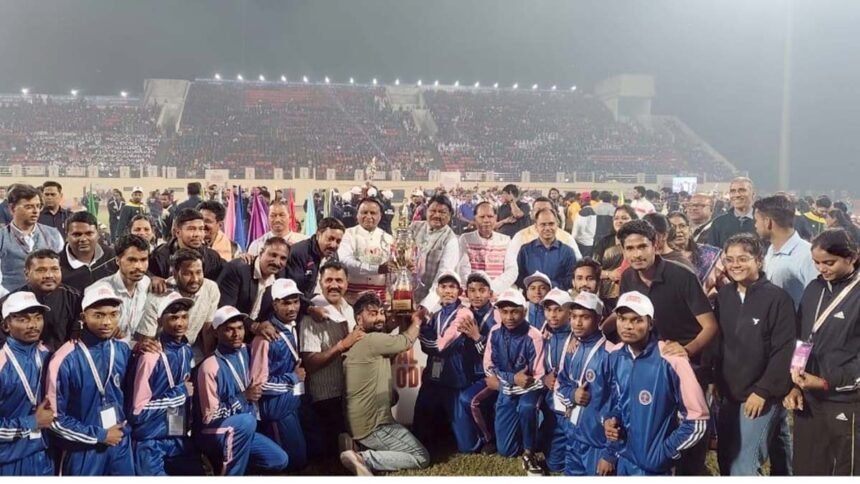 रायपुर। छत्तीसगढ़ के एकलव्य आदर्श आवासीय विद्यालयों के विद्यार्थियों ने शानदार प्रदर्शन करते हुए राष्ट्रीय खेल प्रतियोगिता में दूसरा स्थान पाया है। यह प्रतियोगिता ओडिशा के सुंदरगढ़ में 11 नवंबर से 15 नवंबर 2025 तक आयोजित की गईइस प्रतियोगिता में विभिन्न राज्यों के लगभग 7000 खिलाड़ियों ने भाग लिया। छत्तीसगढ़ राज्य के 75 एकलव्य आदर्श आवासीय विद्यालयों में विद्यालय, जिला, संभाग एवं राज्य स्तरीय चयन प्रक्रिया के बाद 466 प्रतिभागियों सहित कुल 516 सदस्यीय दल इस राष्ट्रीय प्रतियोगिता में सम्मिलित हुए।