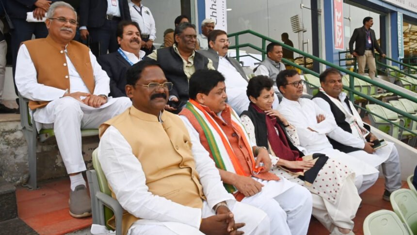 रायपुर। मुख्यमंत्री भूपेश बघेल ने शनिवार को राजधानी रायपुर के शहीद वीर नारायण सिंह अंतरराष्ट्रीय क्रिकेट स्टेडियम नवा रायपुर में भारत और न्यूजीलैंड के बीच खेले गए दूसरे वन डे अंतराष्ट्रीय क्रिकेट मैच का दर्शकों के साथ लुत्फ उठाया। इस दौरान मुख्यमंत्री ने रोहित शर्मा व शुभमन गिल की बैटिंग देखी और चौके छक्कों पर दर्शकों की तरह ही जोश दिखाया। भारत की जीत का जश्न भी मनाया।
