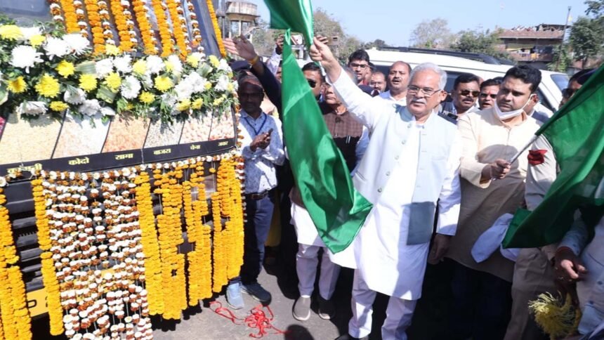रायपुर। मुख्यमंत्री भूपेश बघेल ने आज रायगढ़ जिले के खरसिया में प्रदेश के पहले मोबाईल मिलेट कैफे ‘मिलेट ऑन व्हील्स’ को हरी झंडी दिखाकर रवाना किया। उच्च शिक्षामंत्री उमेश पटेल व गृह मंत्री ताम्रध्वज साहू भी इस अवसर पर उपस्थित रहे। मुख्यमंत्री भूपेश बघेल ने इस मौके पर रागी से बना केक काटा। उन्होंने इस पहल की सराहना करते हुए कहा कि इससे मिलेट के उपभोग के प्रति जागरूकता बढ़ेगी। उन्होंने इस मोबाइल कैफे का संचालन करने वाली महिला समूह को अपनी शुभकामनाएं दीं।