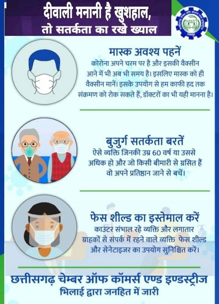 भिलाई। व्यापार के साथ आम जनता को भी जागरुक करने में छत्तीसगढ़ चेम्बर ऑफ कॉमर्स की भिलाई ईकाई हमेशा अग्रणी रहा है। कोरोना संक्रमण काल में व्यापार के साथ ग्राहकों की सुरक्षा के लिए भी भिलाई चेम्बर सजग है। इसे देखते हुए भिलाई चेम्बर शहर के व्यापारियों व ग्राहकों को जागरूक करने एक अभियान चलाने जा रहा है। दीवाली मनानी है खुशहाल तो सतर्कता का रखे ख्याल इस स्लोगन के साथ जागरुकता अभियान की शुरुआत 2 अक्टूबर से होने जा रहा है।