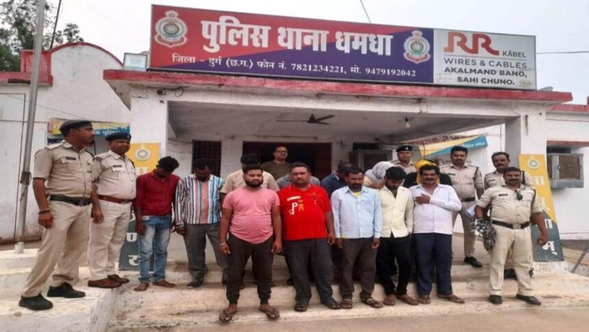 धमधा पुलिस से मिली जानकारी के अनुसार उन्हें मुखबिर के जरिए सूचना मिली कि कुछ जुआरी शिवनाथ नदी किनारे सोनेसरार गांव के पास जुआ खेल रहे हैं। सूचना के बाद टीम बनाकर रेड मारी गई। मौके पर सतीश कुमार नवरंग ग्राम मुरकुटा बेमेतरा, गजेन्द्र कुमार साहू चिरचार बालोद, अनिल टंडन सीताडबरी छुईखदान, उधो कुमार कुर्रे धमधा, सुकालू दास खुटेल लाखाटोला कबीरधाम, शिव सिंह बेमेतरा, जयंत वर्मा बेमेतरा, शरद कुमार वैष्णव कबीरधाम, मनीष बारले धमधा जिला, योगेश साहू राजनांदगांव, प्रदीप मोटवानी हाऊसिंह बोर्ड पदमनाभपुर व मेहताब सिंह कवर्धा को हिरासत में लिया।