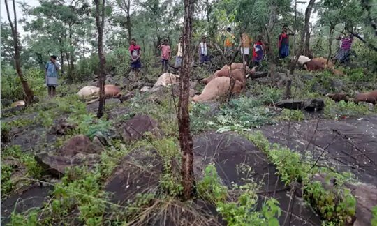 मिली जानकारी के अनुसार दंतेवाड़ा जिले के गदापाल गांव में सुबह किसान अपने मवेशियों को चराने के लिए गए थे। यहां किसान अपने मवेसियों को पहाड़ी इलाकों में चराने ले जाते हैं। मौसम के बदलाव से अंजान किसान मवेशियों के साथ पहाड़ी पर पहुंचे इस दौरान तेज बारिश शुरू हो गई। इस दौरान किसानों ने अपने आप को बचाने के लिए इधर-उधर छिप गए लेकिप मवेशी जंगल में रहे। कुछ देर में तेज बिजली गिरी जिससे सभी किसान दहशत में आ गए। बारिश रुकने के बाद जब किसान पहुंचे तो देखा कि कई मवेशी बिजली की चपेट में आकर मर चुके हैं। इस घटना से लगभग 25 से अधिक मवेशियों की मौत हो गई। जिन किसानों के गायों व बैलों की मौत हुई वे मौके पर ही फूट फूटकर रोने लगे। बताया जाता है कि यह मवेशी ही उनके जीवन यापन का साधन थी।