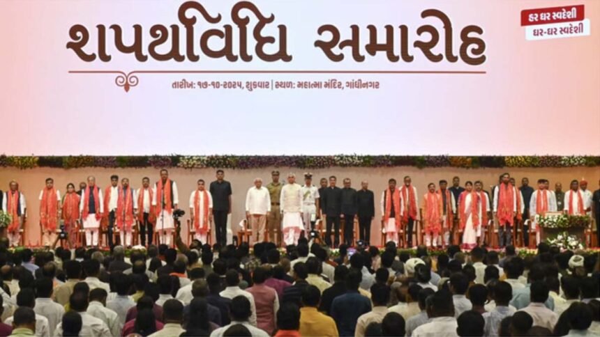 गांधीनगर। गुजरात में भूपेंद्र पटेल सरकार की नई कैबिनेट ने शुक्रवार को शपथ ली। कुल 25 मंत्रियों ने शपथ ग्रहण किया जिसमें से 19 नए चेहरे हैं। मंत्रियों में तीन महिला विधायक भी शामिल हैं। पटेल समाज से CM समेत 8 मंत्री होंगे। 8 OBC, 3 SC, 4 ST और 3 महिलाएं हैं। गुजरात के राज्यपाल आचार्य देवव्रत ने 25 विधायकों को मंत्री पद की शपथ दिलाई। शुकवार को सबसे पहले हर्ष संघवी ने शपथ ली। उन्हें डिप्टी सीएम बनाया गया है। पहले वे राज्य के गृह मंत्री थे। वहीं क्रिकेटर रवींद्र जडेजा की पत्नी रिवाबा को भी मंत्री बनाया गया है।