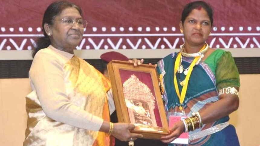 रायपुर। राष्ट्रपति द्रौपदी मुर्मु ने छत्तीसगढ़ की प्रतिभाशाली धातुकला शिल्पकार हीराबाई झरेका बघेल को उनकी उत्कृष्ट कलात्मक उपलब्धियों के लिए राष्ट्रीय हस्तशिल्प पुरस्कार से सम्मानित किया है। यह पुरस्कार छत्तीसगढ़ की समृद्ध धातुकला परंपरा को राष्ट्रीय एवं अंतरराष्ट्रीय स्तर पर प्रतिष्ठित स्थान दिलाने के लिए उनकी सराहनीय सेवा का प्रतीक है। राष्ट्रपति द्रौपदी मुर्मु ने नई दिल्ली के विज्ञान भवन में आयोजित राष्ट्रीय हस्तशिल्प समारोह में देश भर के हस्तशिल्पियों को सम्मानित किया। कार्यक्रम की अध्यक्षता केंद्रीय वस्त्र मंत्री गिरिराज सिंह ने की, इस मौके पर राज्य मंत्री पबित्रा मार्गेरिटा कार्यक्रम में विशेष अतिथि के रूप उपस्थित थीं।