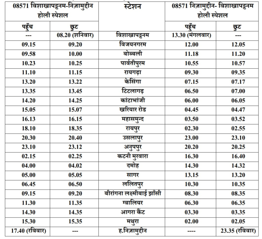 रायपुर। रेलवे द्वारा होली के अवसर पर विशाखापट्टनम-निज़ामुद्दीन के मध्य गाड़ियों में होने वाली भीड़ को ध्यान में रखते हुए एक होली स्पेशल सुपर फास्ट ट्रेन दो फेरे के लिये चलाई जाएगी। यह गाड़ी विशाखापट्टनम से 08571 नंम्बर के साथ तथा निज़ामुद्दीन से 08572 नम्बर के साथ चलेगी। 08571 विशाखापट्टनम-निज़ामुद्दीन होली स्पेशल विशाखापट्टनम से 23 एवं 30 मार्च, 2024 तथा 08572 निज़ामुद्दीन-विशाखापट्टनम होली स्पेशल निज़ामुद्दीन से 24 एवं 31 मार्च, 2024 को चलेगी । इस स्पेशल ट्रेन में 2 एसएलआर/एसएलआरडी, 2 सामान्य, 13 एसी-III,2 एसी -II सहित कुल 19 कोच होंगे।