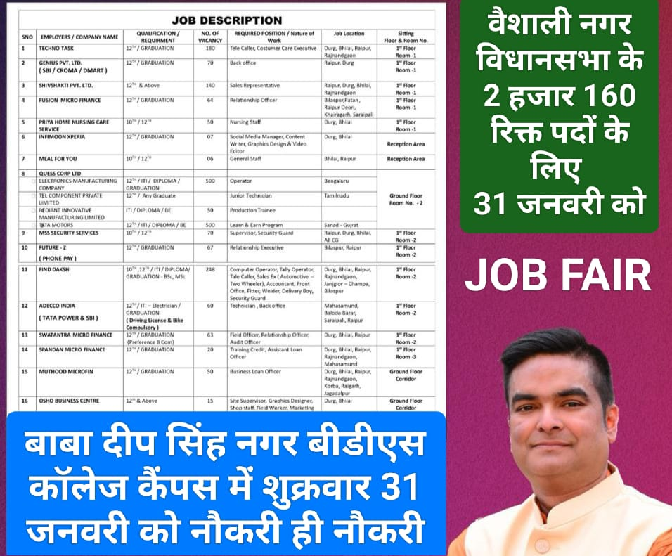 भिलाई। वैशाली नगर विधायक रिकेश सेन के प्रयास से निजी क्षेत्र की नौकरियों के लिए 2100 से अधिक पदों के लिए वैशाली नगर विधानसभा और समीपस्थ क्षेत्र के युवाओं को जॉब का एक गोल्डन चांस मिल रहा है। आपको बता दें कि बाबा दीप सिंह नगर में 31 जनवरी शुक्रवार को यह मेगा जॉब फेयर आयोजित किया गया है। जिसमें शामिल होकर योग्यता अनुसार इच्छुक 2 हजार 160 युवा दुर्ग, भिलाई, रायपुर, राजनांदगांव, कोरबा, महासमुंद, बलौदा बाजार, रायगढ़, बिलासपुर, बेंगलुरु, तमिलनाडु और गुजरात में नौकरी पा सकते हैं।