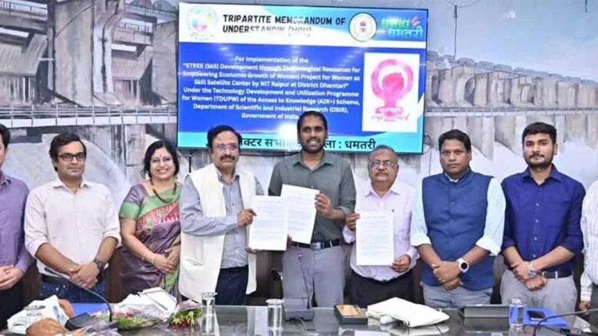 धमतरी। ग्रामीण महिलाओं के आर्थिक एवं सामाजिक सशक्तिकरण की दिशा में धमतरी जिले में एक ऐतिहासिक पहल की गई है। कलेक्टोरेट परिसर में नेशनल इंस्टीट्यूट ऑफ टेक्नोलॉजी (NIT) रायपुर, जिला प्रशासन धमतरी और बीआरपी शासकीय पॉलिटेक्निक कॉलेज के बीच ‘STREE’ (Skill Development through Technological Resources for Empowering Economic Growth of Women) परियोजना के सफल क्रियान्वयन हेतु त्रिपक्षीय समझौता ज्ञापन (MoU) पर हस्ताक्षर किए गए।