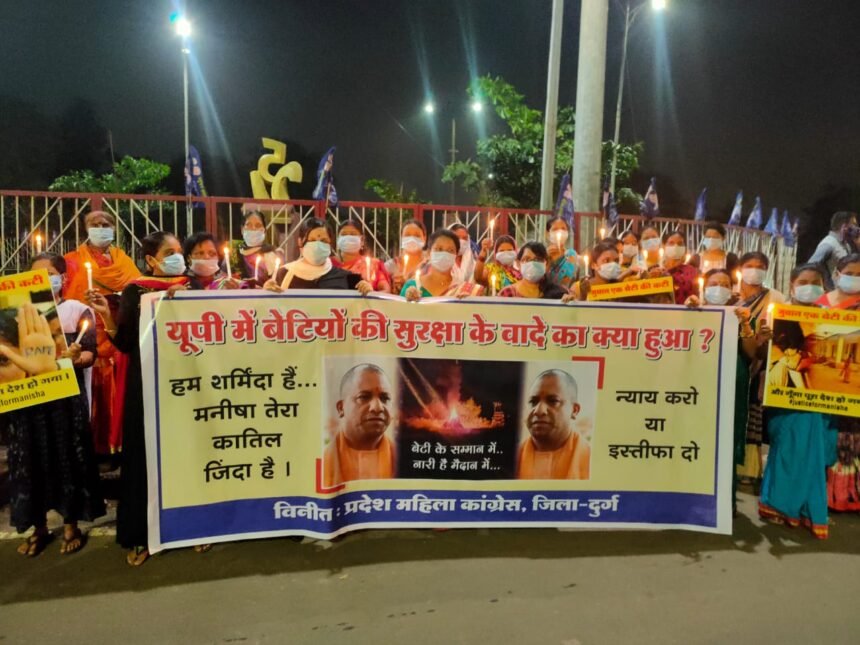 उत्तर प्रदेश की गैंगरेप की घटना के विरोध में प्रदेश कांग्रेस कमेटी लगातार जोरदार तरीके से विरोध प्रदर्शन कर रही है। पार्टी के द्वारा इस विरोध प्रदर्शन को और उग्र तथा असरकारक बनाने अपने महिला विंग को बड़ी जिम्मेदारी दी गई है। प्रदेश कांग्रेस कमेटी की अध्यक्ष श्रीमती फूलों देवी नेताम तथा विधायक देवेंद्र यादव ने दुर्ग जिला महिला कांग्रेस को उक्त मुद्दे को लेकर योगी सरकार के खिलाफजोरदार विरोध प्रदर्शन करने की जिम्मेदारी देते हुए विश्वास व्यक्त किया है कि दुर्ग जिले से उक्त घटना के विरोध में महिलाओं की जो आवाज गुंजेगी उससे निश्चित रूप से पूरी उत्तर प्रदेश सरकार हिल जाएगी और योगी सरकार को भंग करना पड़ेगा। जिला महिला कांग्रेस कमेटी के द्वारा इस विरोध प्रदर्शन आंदोलन को सफल बनाने व्यापक तैयारियां की गई थी । पूरे विरोध प्रदर्शन कार्यक्रम में इसी तैयारियों के फल स्वरूप महिलाओं की बड़ी संख्या में भीड़ एकत्रित हुई थी और योगी सरकार के विरोध में लगाए जा रहे हैं नारों से पूरा इलाका गूंज रहा था।
