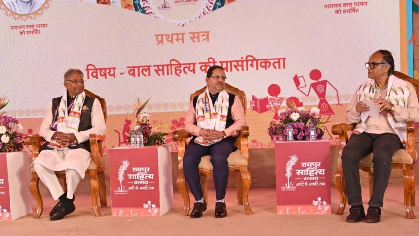 रायपुर। रायपुर साहित्य उत्सव के तीसरे दिन कवि-कथाकार अनिरुद्ध नीरव मंडप में बाल साहित्य की प्रासंगिकता का सत्र ख्यातिलब्ध साहित्यकार नारायण लाल परमार को समर्पित रहा। जिसमें साहित्य अकादमी मध्यप्रदेश के अध्यक्ष डॉ. गोपाल दवे, बाल साहित्यकार बलदाऊ राम साहू बतौर वक्ता परिचर्चा में शामिल हुए, जिसके सूत्रधार एस के बिसेन रहे। इस अवसर पर देवभोग के कृष्ण कुमार अजनबी द्वारा लिखित बाल कविता संग्रह आंखों का तारा, ओमप्रकाश जैन की पुस्तक जीवन चक्र और संतोष कुमार मिरी की पुस्तक जीवन बोध का विमोचन किया गया।