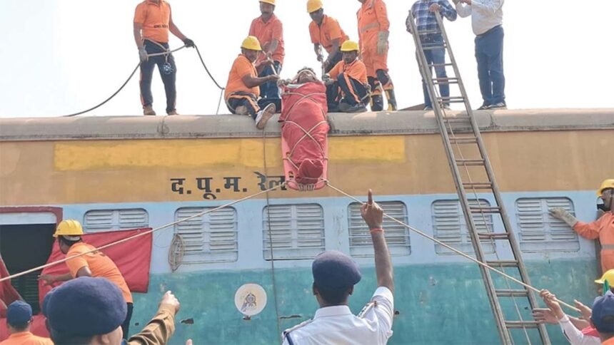 भिलाई। दुर्ग जिले के भिलाई चरोदा स्थित डीबी यार्ड के पास शुक्रवार सुबह लगभग पौने 11 बजे ट्रेन हादसे की खबर से हड़कंप मच गया। भिलाई मार्शलिंग यार्ड से लगे उरला दुग्ध संयंत्र के पास स्पेशल पैसेंजर ट्रेन की एक बोगी डिरेल होने के बाद आग लग गई। सूचना पर पहुंची एनडीआरएफ की टीम ने बीएसपी फायर ब्रिगेड, आरपीएफ और रेलवे की दुर्घटना राहत टीम के साथ मिलकर रेस्क्यू ऑपरेशन चलाया। इस दौरान डिरेल बोगी का छत काटकर 25 से 30 गंभीर व आंशिक रूप से घायल यात्रियों को सुरक्षित बाहर निकाला और मौके पर प्राथमिक उपचार देकर नजदीकी अस्पताल भेजा गया।