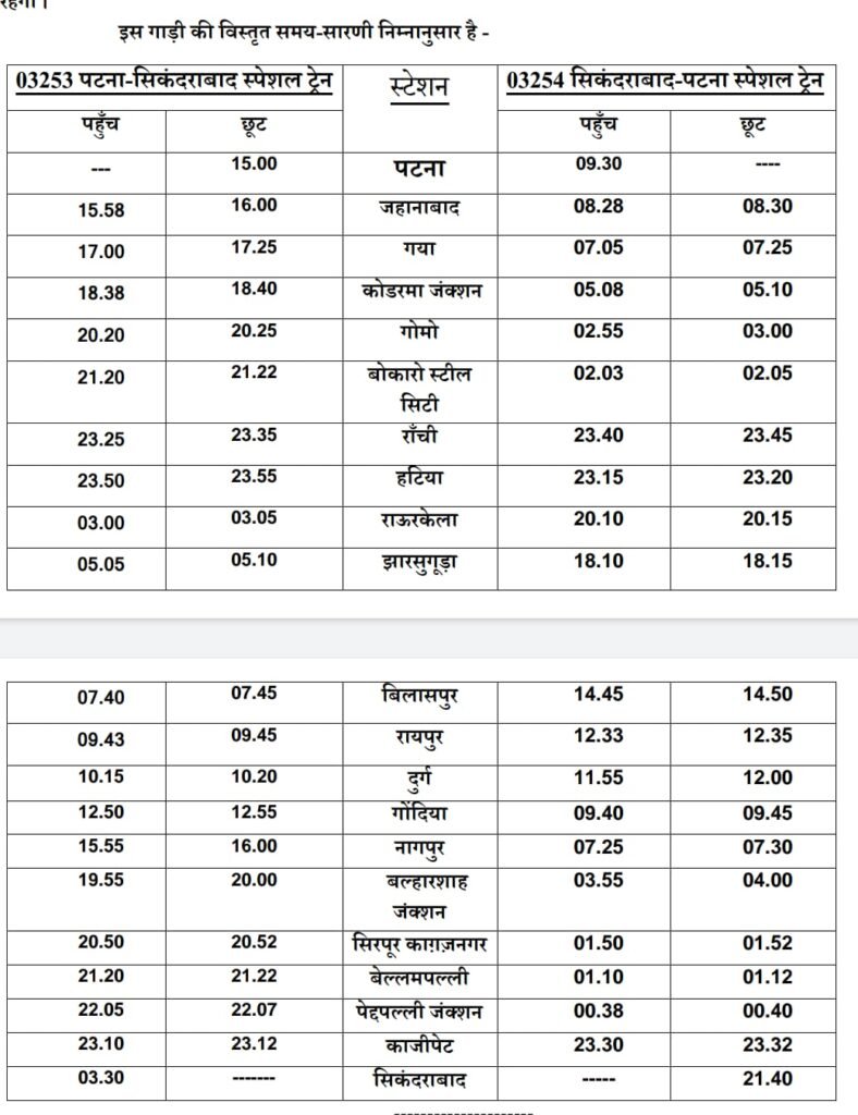 दक्षिण पूर्व मध्य रेलवे से मिली जानकारी के अनुसार रेलवे प्रशासन के द्वारा एक स्पेशल ट्रेन 03253/ 03254 पटना-सिकंदराबाद-पटना रूट पर चलाया जा रहा है। यह स्पेशल ट्रेन पटना एवं सिकंदराबाद के मध्य 11 फेरो के लिए चलाई जाएगी । यह गाड़ी पटना से प्रत्येक सोमवार एवं बुधवार को ट्रेन नंबर 03253 पटना-सिकंदराबाद स्पेशल ट्रेन 26 दिसम्बर, 2022 से 30 जनवरी, 2023 तक तथा सिकंदराबाद से प्रत्येक बुधवार एवं शुक्रवार को ट्रेन नंबर 03254 सिकंदराबाद-पटना स्पेशल ट्रेन नम्बर के साथ 28 दिसम्बर, 22 से 02 फरवरी, 2023 तक चलेगी । इस स्पेशल ट्रेन में 2 एसएलआर, 02 सामान्य, 14 स्लीपर, 04 एसी थ्री, 02 एसी-टू  श्रेणी सहित कुल 24 कोच रहेंगे । यह गाड़ी पूरी तरह आरक्षित है एवं केवल कंफर्म टिकट यात्रियों को ही यात्रा करने की अनुमति रहेगी ।