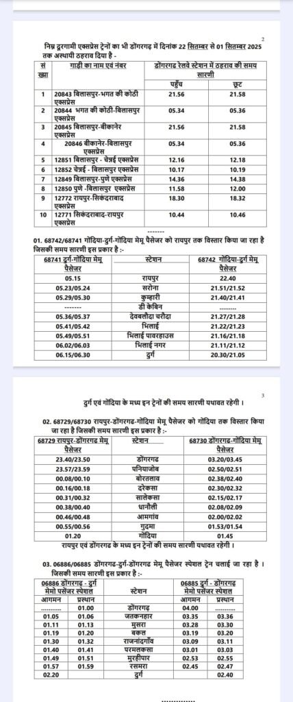 गोंदिया-दुर्ग मेमू को 9 दिन के लिए रायपुर तक बढ़ाया गया है। यह ट्रेन गोंदिया से दुर्ग तक पहुंचने के बाद भिलाई नगर, भिलाई पावर हाउस, भिलाई, देव बलौदा चरौदा, डी-केबिन, कुम्हारी, सरोना होते हुए रायपुर पहुंचेगी। वापसी में भी यही मार्ग तय करते हुए गोंदिया लौटेगी। इसी तरह रायपुर-डोंगरगढ़ मेमू को 9 दिन के लिए गोंदिया तक बढ़ाया गया है। यह ट्रेन डोंगरगढ़ से चलकर गुदमा, आमगांव, धानौली, सालेकसा, दरेकसा, बोरतलाव, पनिया-जोब होते हुए गोंदिया पहुंचेगी। वापसी में गोंदिया से डोंगरगढ़ होते हुए रायपुर तक जाएगी। इसके अतिरिक्त दुर्ग और डोंगरगढ़ के मध्य 9 दिन के लिए एक मेमू स्पेशल ट्रेन भी चलाई जाएगी। यह ट्रेन दुर्ग से रसमरा, मुरहीपार, परमलकसा, राजनांदगांव, बकल, मुसरा, जटकन्हार होते हुए डोंगरगढ़ पहुंचेगी।
