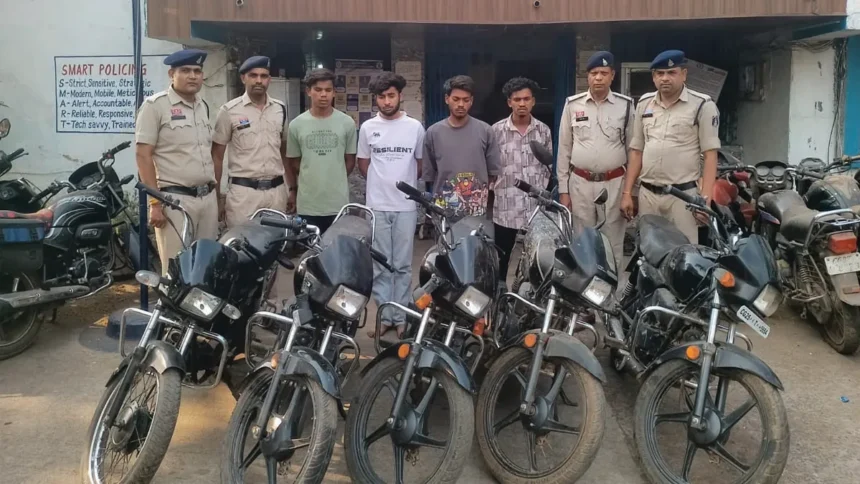 भिलाई। सार्वजनिक स्थानों से बाइक चोरी करने वाले एक गिरोह का पर्दाफाश किया है। इस गिरोह में एक नाबालिग समेत कुल 5 आरोपी शामिल हैं। आरोपी भीड़भाड़ वाले इलाकों में खड़ी दोपहिया वाहनों को निशाना बनाते थे और चोरी के बाद उन्हें भिलाई नगर रेलवे स्टेशन के पास स्थित गौठान की झाड़ियों में छिपाकर रख देते थे। आरोपियों के पास से 6 चोरी के वाहन भी बरामद किए गए हैं, जिनमें 5 स्प्लेंडर और 1 एक्टिवा शामिल है। आरोपी बाइक और स्कूटी को ही निशाना बनाते थे। पुलिस ने चारों आरोपियों को जेल भेज दिया है और एक नाबालिग को अभिरक्षा में रखा गया है। मामला सुपेला थाना क्षेत्र का है।