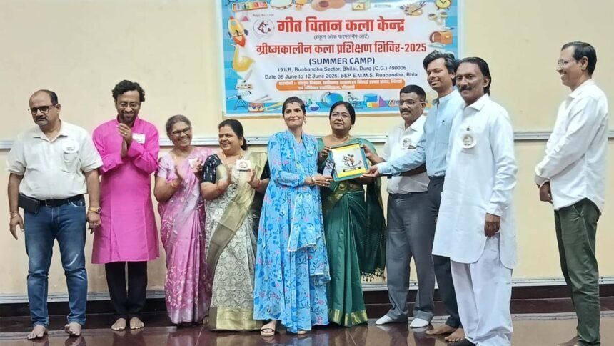 भिलाई। गीत वितान कला केंद्र (स्कूल ऑफ परफॉर्मिंग आर्ट्स) रूआबांधा द्वारा सात दिवसीय ग्रीष्मकालीन कला प्रशिक्षण शिविर 2025 का आयोजन किया गया। इस प्रशिक्षण शिविर के माध्यम से बाल प्रतिभाओं को एक सशक्त मंच मिला। बच्चों की कला एवं अभिव्यक्ति को नया आयाम देने यह प्रशिक्षण शिविर का आयोजन किया गया। प्रशिक्षण शिविर का समापन समारोह प्रगति भवन, सिविक सेंटर, भव्य रूप से संपन्न हुआ।