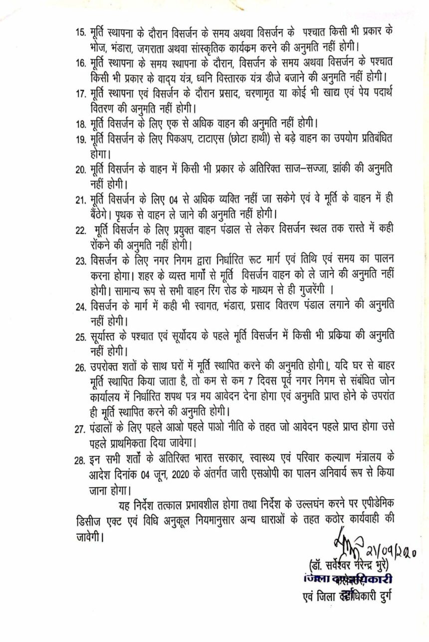 जिला कलेक्टर द्वारा जारी दिशा निर्देशों के मुताबिक मूर्ति स्थापना और विसर्जन के दौरान किसी भी तरह के भोग, भंडारे का आयोजन नहीं होगा। मूर्ति विसर्जन में एक से अधिक वाहन की अनुमति नहीं होगी। बिना मास्क के पंडाल में पहुंचे व्यक्ति के साथ समिति पर भी कार्रवाई होगी। मूर्ति स्थापित करने वाली समिति को थर्मल स्क्रीनिंग मशीन, सेनेटाइजर अनिवार्य रूप से रखना होगा। सोशल डिस्टेंसिंग के लिए बांस बल्ली से बेरिकेडिंग करनी होगी। कलेक्टर द्वारा जारी आदेश में कहा गया है कि कंटेनमेंट जोन में मूर्ति स्थापना की अनुमति नहीं होगी।