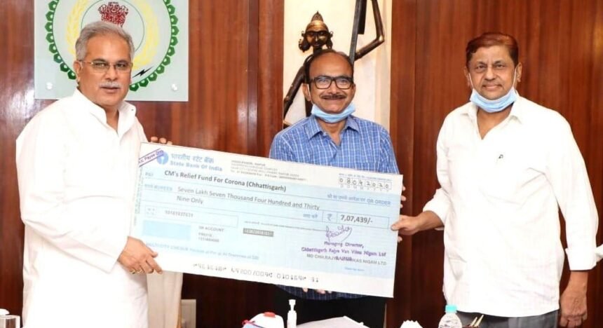 रायपुर। मुख्यमंत्री भूपेश बघेल को आज यहां उनके निवास कार्यालय में वन विभाग की समीक्षा बैठक के दौरान छत्तीसगढ़ राज्य वन विकास निगम द्वारा मुख्यमंत्री सहायता कोष में अपने विभागीय अधिकारी-कर्मचारियों के वेतन में से 7 लाख 7 हजार 439 रूपए की राशि का चेक सौंपा गया। मुख्यमंत्री श्री बघेल ने कोविड-19 के कारण उत्पन्न विषम परिस्थिति से निपटने के लिए निगम के सहयोग की सराहना की। इस अवसर पर वन मंत्री मोहम्मद अकबर, मुख्य सचिव आर.पी. मण्डल, मुख्यमंत्री के अपर मुख्य सचिव सुब्रत साहू, वन विभाग के प्रमुख सचिव मनोज कुमार पिंगुआ, प्रधान मुख्य वन संरक्षक राकेश चतुर्वेदी, प्रधान मुख्य वन संरक्षक राज्य वन विकास निगम आर. गोवर्धन, वन विभाग के सचिव जयसिंह म्हस्के तथा मुख्यमंत्री सचिवालय में उप सचिव सुश्री सौम्या चौरसिया और वरिष्ठ विभागीय अधिकारी उपस्थित थे।